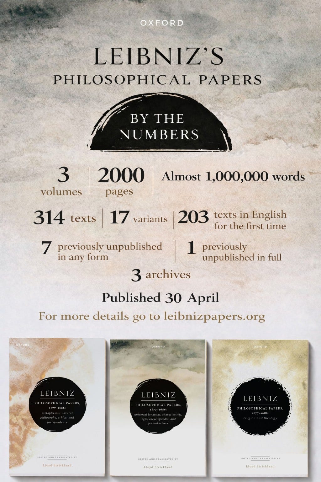 Dr. Strickland ist als unser Führer durch die Werke von Leibniz besonders geeignet, da er der Autor einer 3-bändigen Ausgabe von Leibniz’ Philosophischen Schriften ist, die nächste Woche veröffentlicht wird. Weitere Informationen zu den drei Bänden erhalten Sie hier: